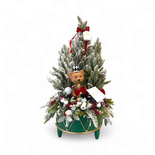 Centrotavola con Alberello e Orsetto su Base a Tamburo Verde 65 h cm - Fiori di Lena