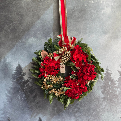 Ghirlanda Tonda con Ortensie Rosse in Velluto D60 - Fiori di Lena