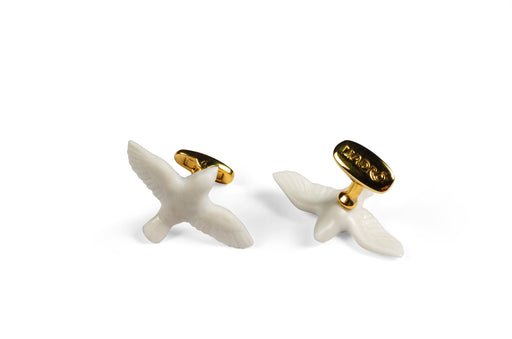 LladroGemelli in ottone bagnati in oro 18 karati decorati con un piccolo uccello in porcellana lucida realizzato a mano.